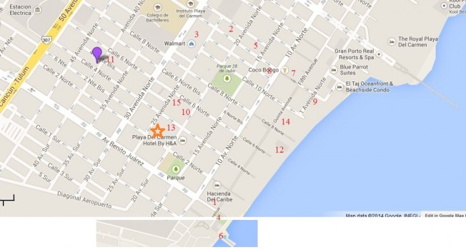 Playa del Carmen ma swój urok: to malutka miejscowość, która w sezonie (od Bożego Narodzenia do Wielkanocy) pęka w szwach pod natłokiem turystów. Ulice są tutaj położone według następującego schematu: Avenidas (aleje) równolegle do wybrzeża, nazywane liczbami nieparzystymi co pięć, a Calles (ulice) prostopadle do wybrzeża, liczone co dwa, parzyście. Tym sposobem adres stanowi opis kwadratu (cuadra), w którym znajduje się szukany obiekt, np. dziesiąta aleja, pomiędzy ulicą drugą a czwartą na Północ.